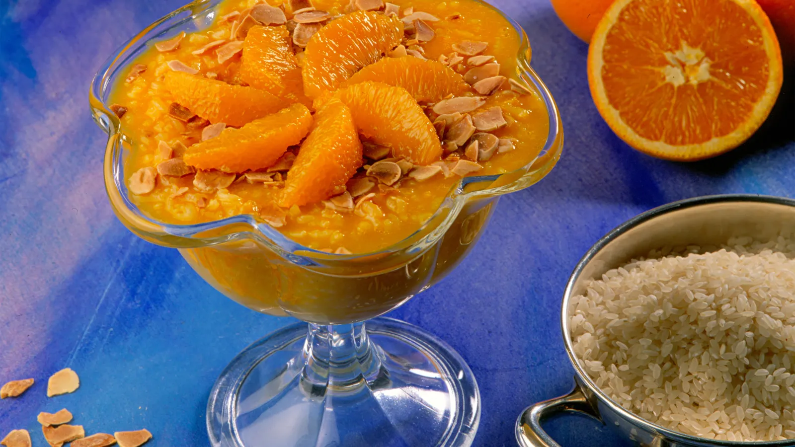 Cuece el arroz con el zumo y la ralladura y remueve a fuego suave. Cuando esté casi cocido, unos 15 minutos, añade la miel o el azúcar con el azafrán y deja unos 5 minutos más al fuego hasta que esté a punto Reparte en cazuelitas individuales, y cuando esté frío, decora con la almendra tostada y unos gajos de naranja sin piel.