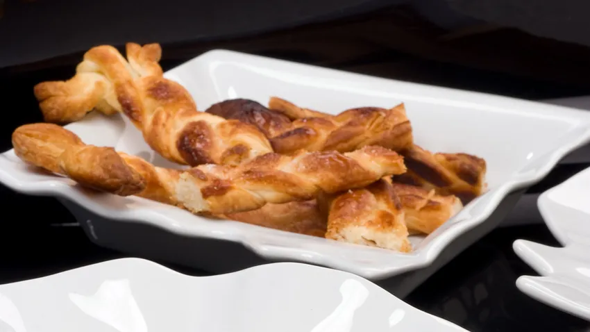 Recorta dos rectángulos anchos y largos de hojaldre y corta 3 tiras finas en cada uno sin llegar hasta el final. Haz una trenza con cada rectángulo y ponlas en una fuente de horno. Píntalas con huevo batido y espolvorea cada una con un poco de azúcar. Hornéalas a 200ºC durante 15 minutos aproximadamente.