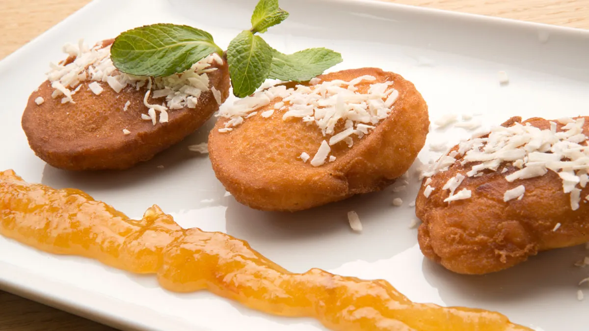 Postre de Eva Arguiñano de bizcochitos fritos acompañados de mermelada de naranja y coco rallado, una forma diferente de preparar bizcocho.