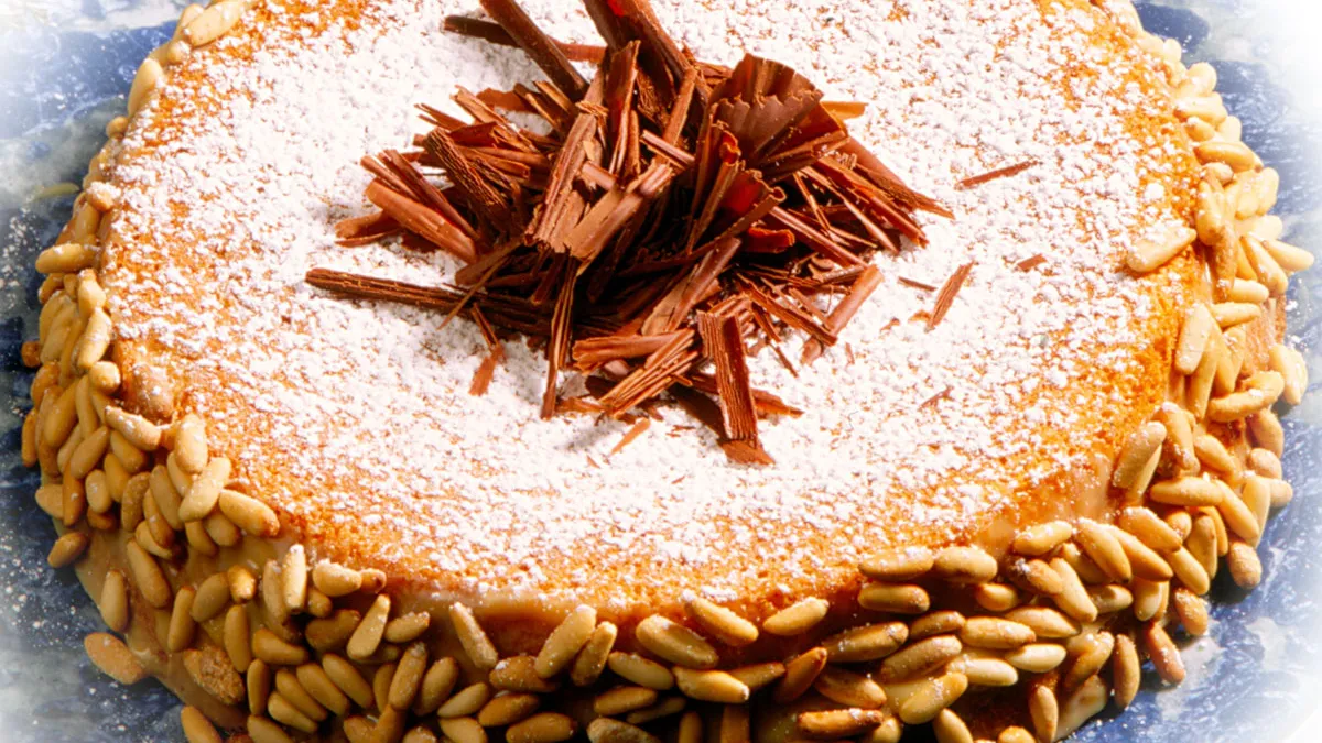Receta de Karlos Arguiñano de bizcocho relleno con dulce de leche y decorado con piñones y virutas de chocolate. Una tarta fácil de preparar perfecta para cumpleaños y otras celebraciones.
