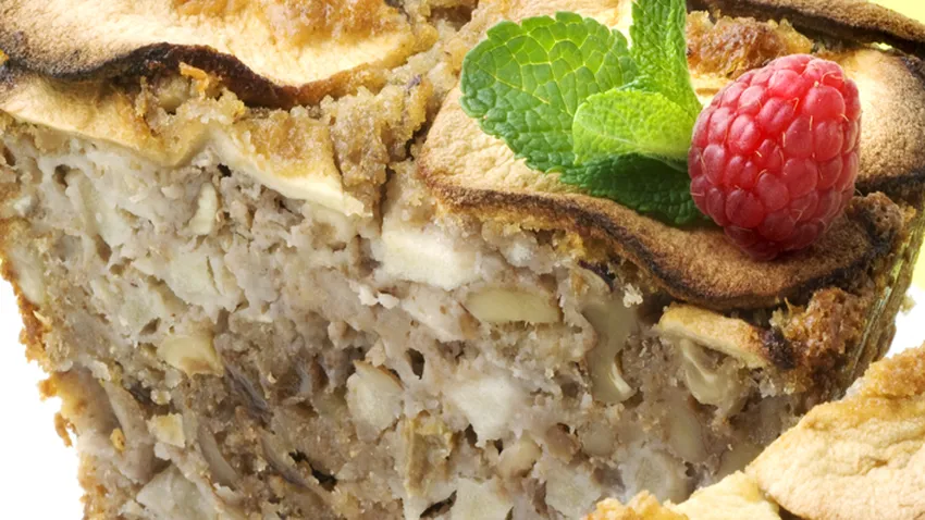 Postre de Eva Arguiñano: bizcocho de manzana y frutos secos: nueces, avellanas y uvas pasas.