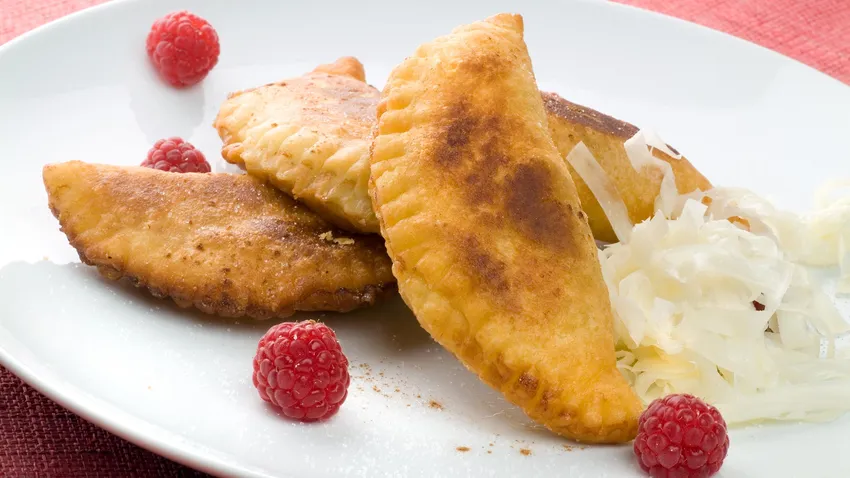 Ralla el queso con el rallador. Coloca las empanadillas en un plato y acompaña con un montoncito de queso rallado. Decora con frambuesas y con una pizca de azúcar y canela.