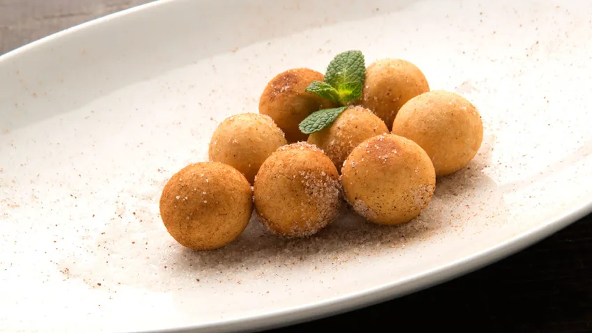 Mezcla un poco de azúcar con canela y espolvorea una fuente. Coloca encima las bolitas y vuelve a espolvorear. Adórnalas con unas hojas de menta.