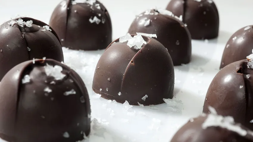 Pon el relleno en una manga pastelera. Antes de verter el relleno, añade unas escamas de sal en la mitad de los huecos. Rellena los bombones. Deja que se enfríen durante 2 horas.