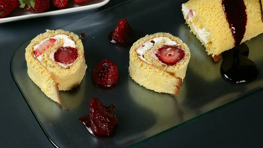 Receta de bizcocho de huevo relleno de fresas y nata montada.
