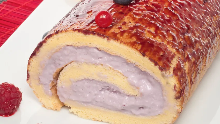 La receta de brazo de gitano a base de bizcocho relleno de crema de queso fresco con frutos del bosque o frutos rojos.