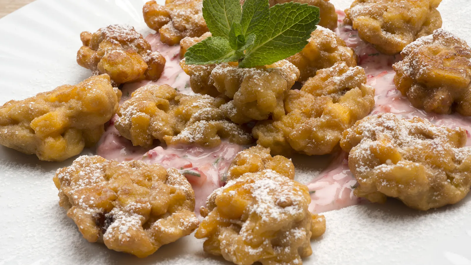 Coloca la salsa en el fondo del plato y coloca encima los buñuelos. Espolvorea con el azúcar glas reservado. Decora con una ramita de menta. Sirve.