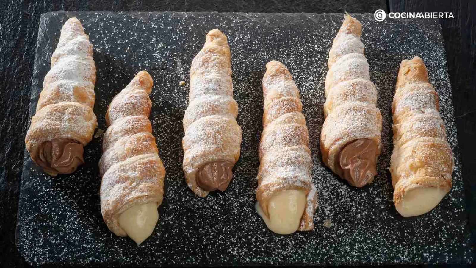 Canutillos de hojaldre rellenos de crema y chantilly de chocolate