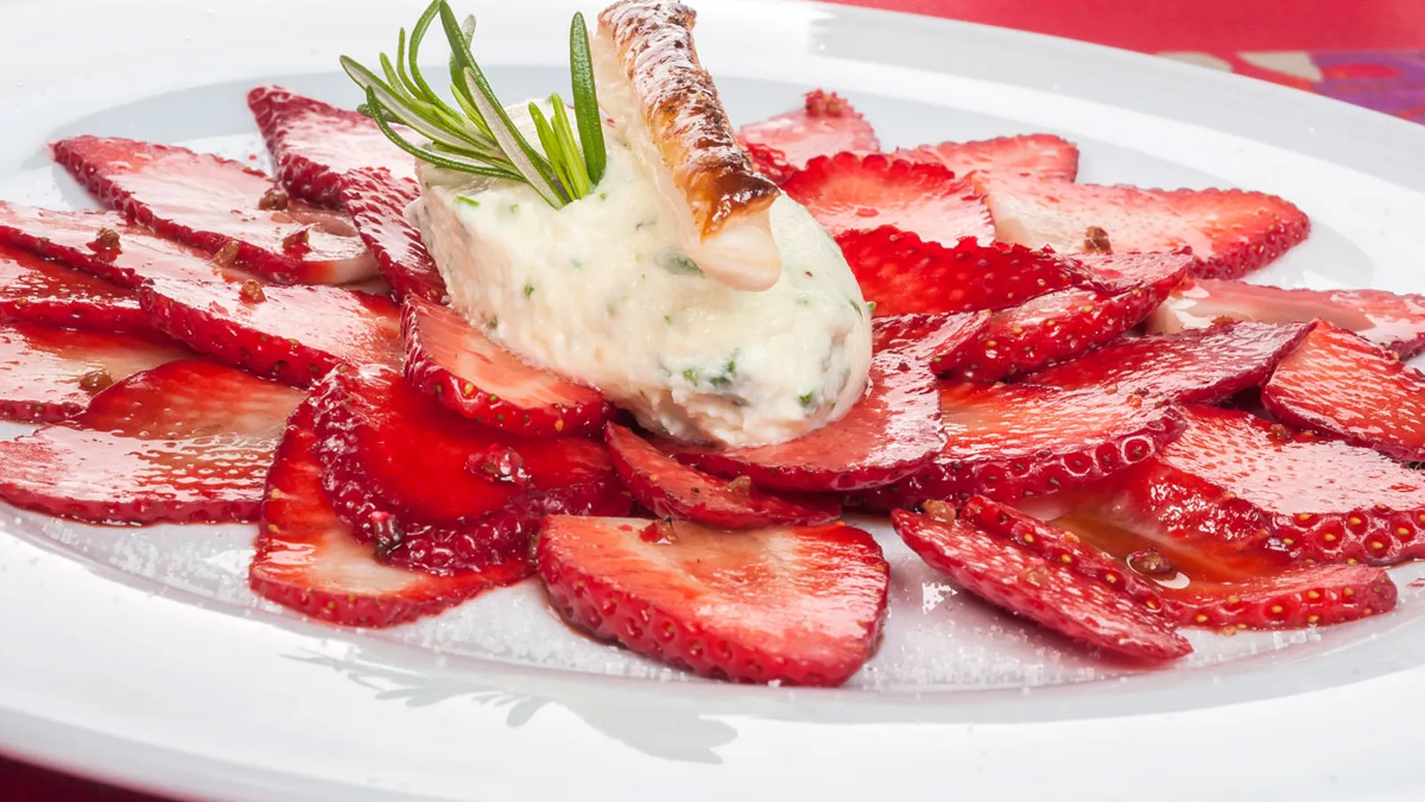 Receta de Bruno Oteiza de carpaccio de fresas acompañadas de queso mascarpone a la pimienta y bastones de hojaldre.