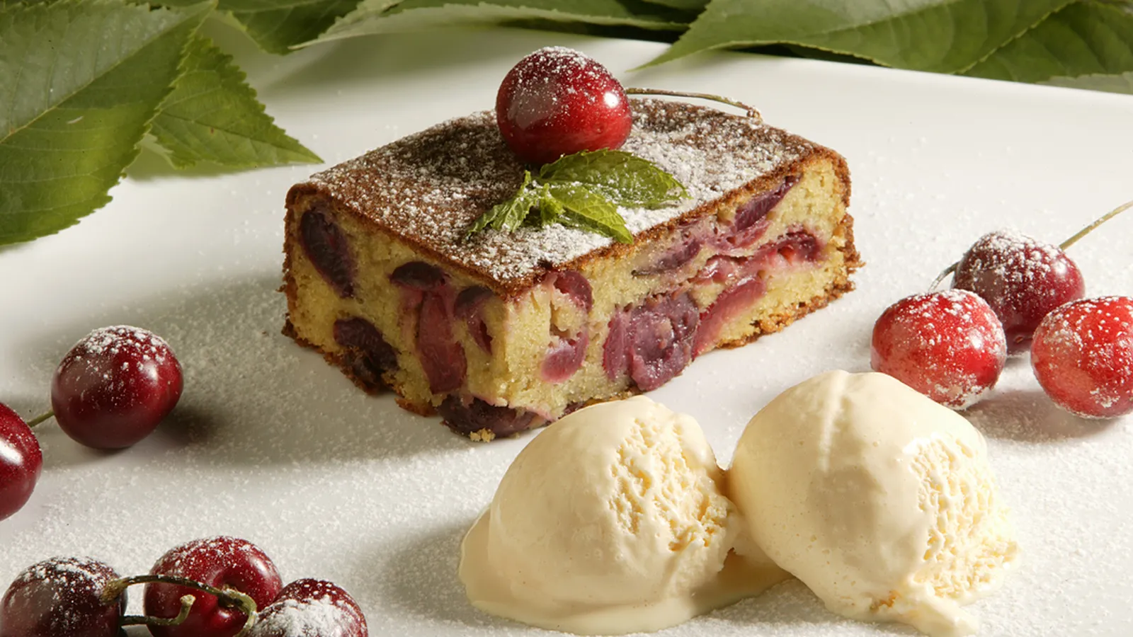 Introduce en el horno (previamente calentado) a 200ºC durante 30-40 minutos. Desmóldalo y espolvoréalo con un poco de azúcar glas. Decora con unas cerezas y unas hojas de menta.