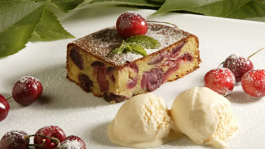 Delicioso postre de bizcocho relleno de cerezas al horno de Karlos Arguiñano. Una receta especial con cerezas de temporada, propia de la primavera.