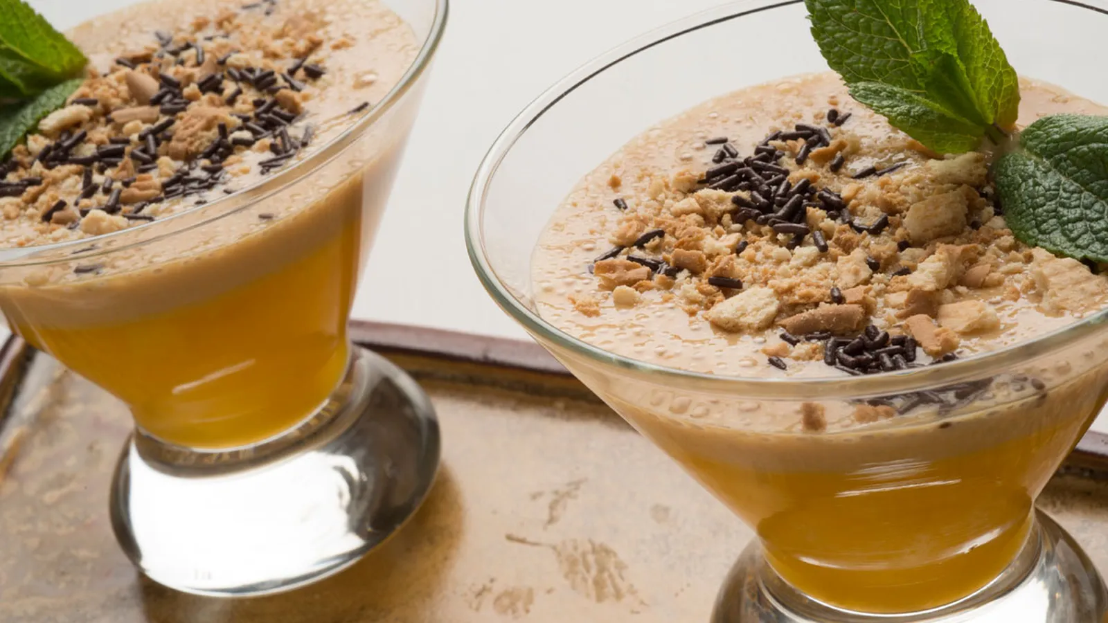 Receta de Eva Arguiñano de copas de gelatina de naranja con flan y galletas, un postre muy sencillo apto para personas con colesterol.