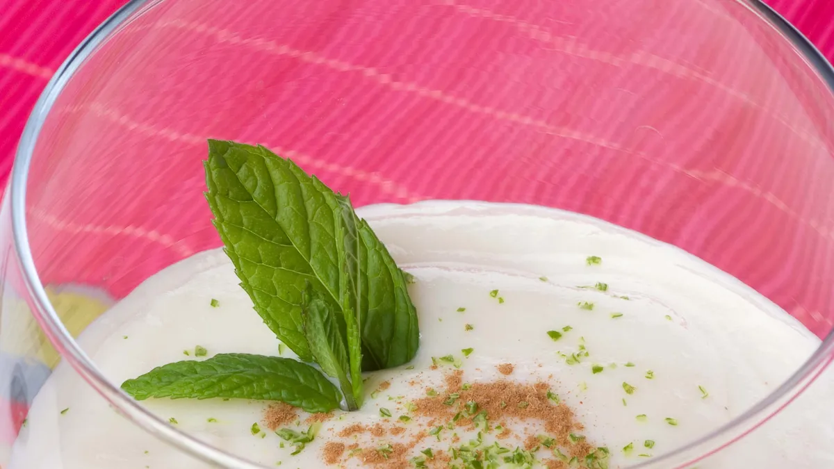 Coloca la crema en dos copas y deja enfriar. Espolvorea canela por encima, ralla un poco de cáscara de lima y adorna con unas hojitas de menta.