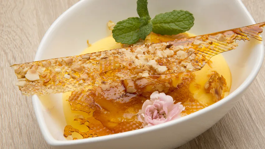 Sirve la crema catalana con unas tejas de caramelo y avellana y decora con unas hojas de menta.