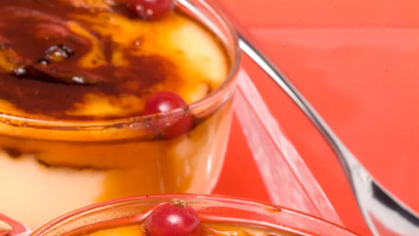 Sirve la crema catalana con sorpresa y decora con unas grosellas.