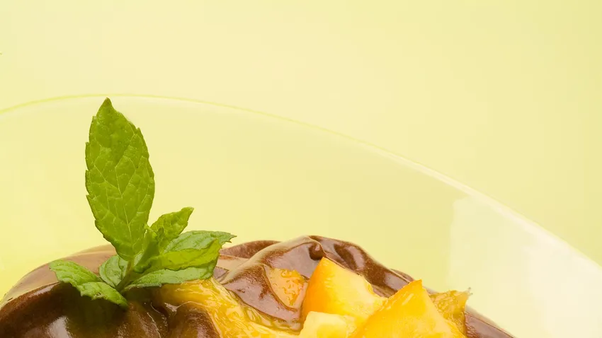 Para emplatar, coloca parte de la naranja en la base de dos copas, vierte por encima el chocolate y decora con el resto de naranja. Sirve.