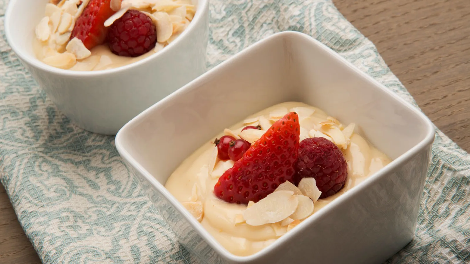 Eva Arguiñano prepara un postre de crema de leche condensada y almendras decorada con frutos rojos, una receta sencilla elaborada sin horno y apta para celíacos, ya que no contiene gluten.