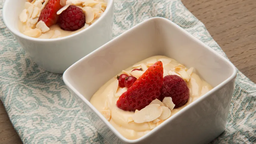 Tuesta las almendras en una sartén sin aceite. Retira y deja que se enfríen. Espolvoréalas sobre las cremas. Adorna las cremas con los frutos rojos.