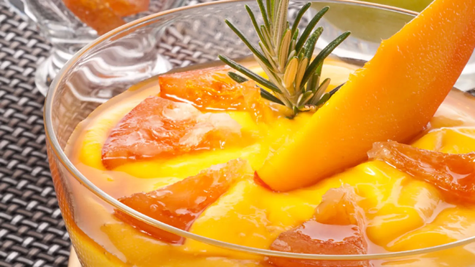 Distribuye la mezcla en 4 copas, adorna cada una con un gajo de mango, unos trocitos de naranja escarchada y unas hojitas de romero. Rocía cada copa con un poco de jarabe de arce y sirve.