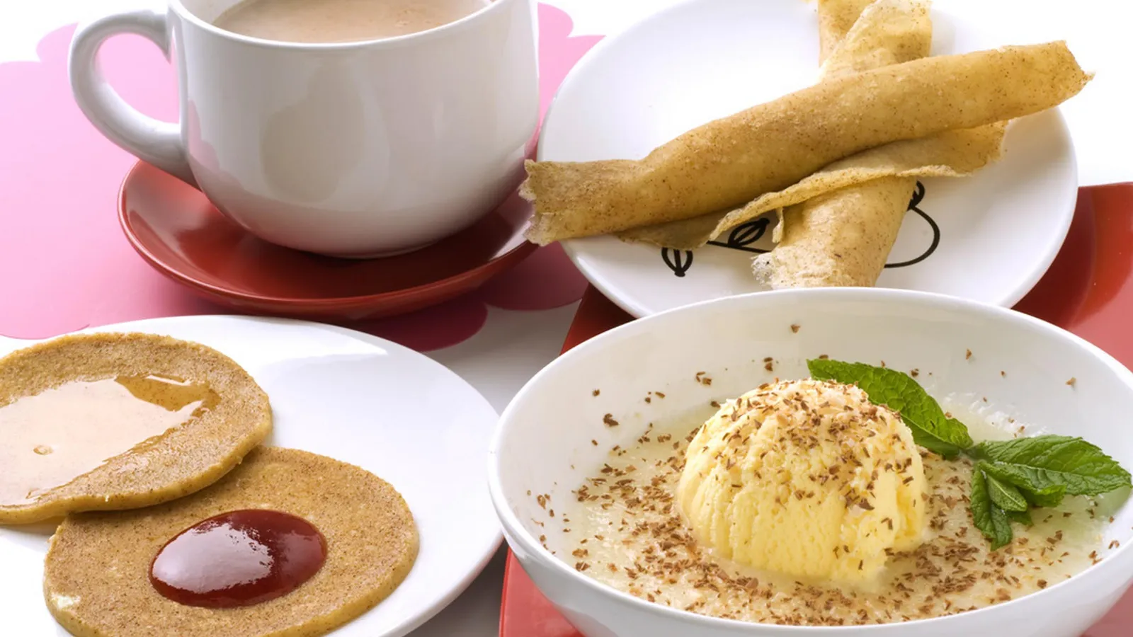Crepes de quinoa, zumo de melón con vainilla y leche de cacao