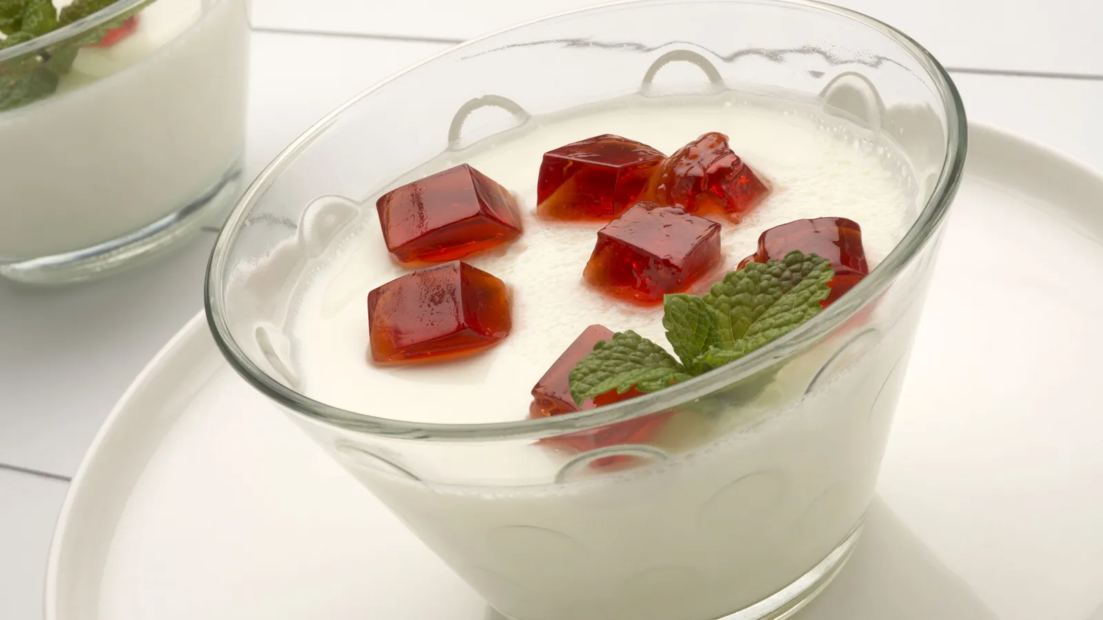Sirve las cuajadas y decóralas con trocitos de gelatina. Adorna con unas hojas de menta.