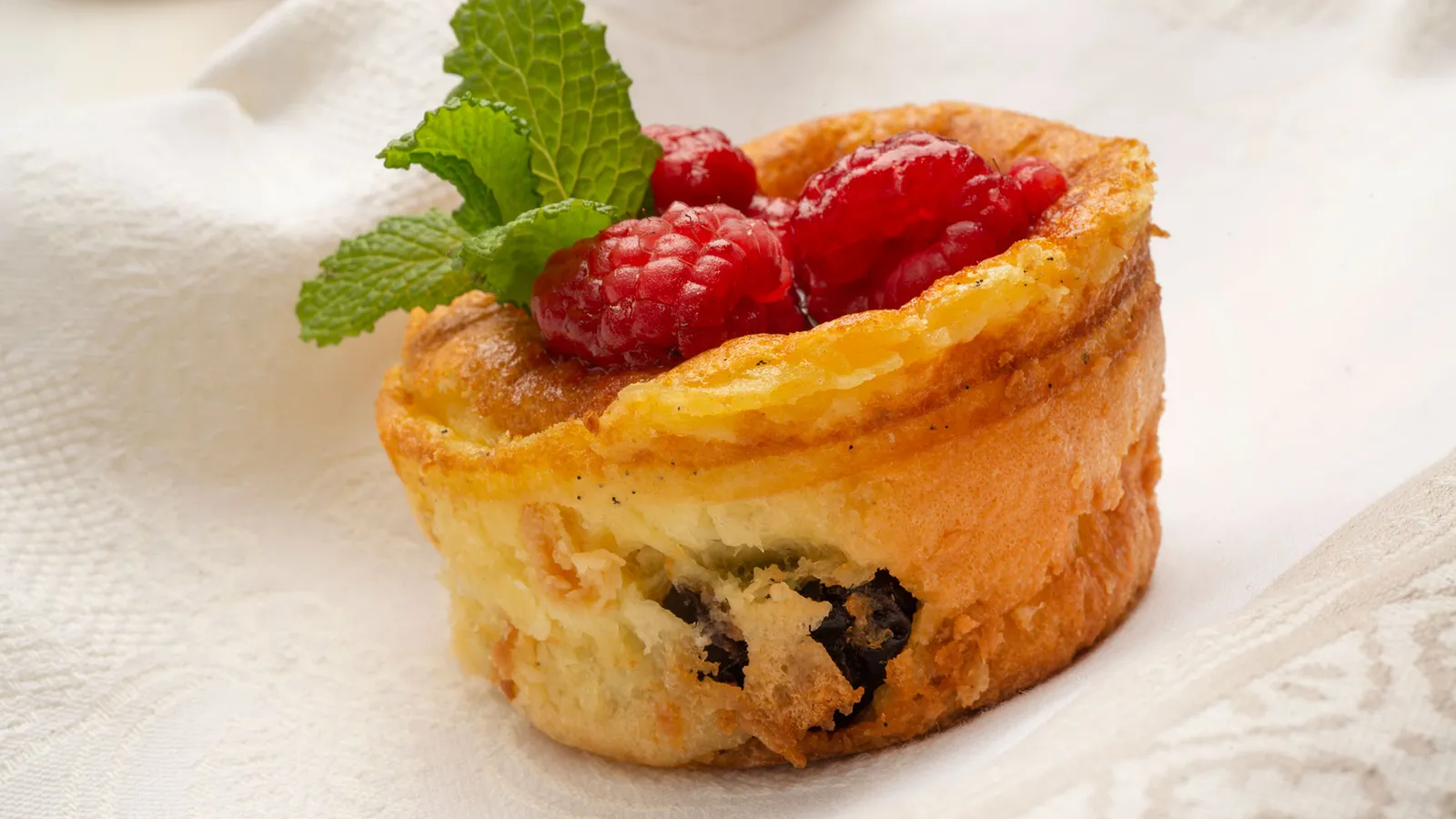Desmolda (nunca en caliente) los cuajados de ciruela y pon encima de cada uno unas frambuesas. Decora con unas hojitas de menta.