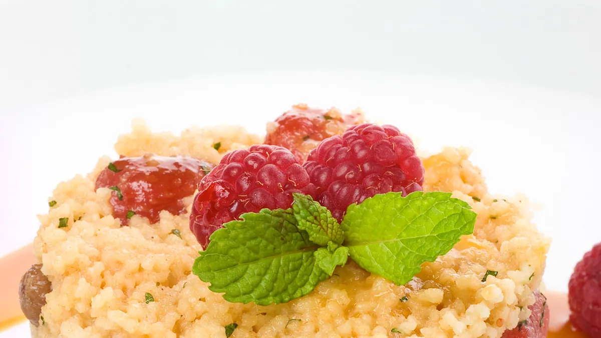 Deliciosa y original receta de cuscús dulce propuesta por Bruno Oteiza, un postre lleno de sabores con pasas, fresas deshidratadas, albaricoques secos, plátanos y menta.