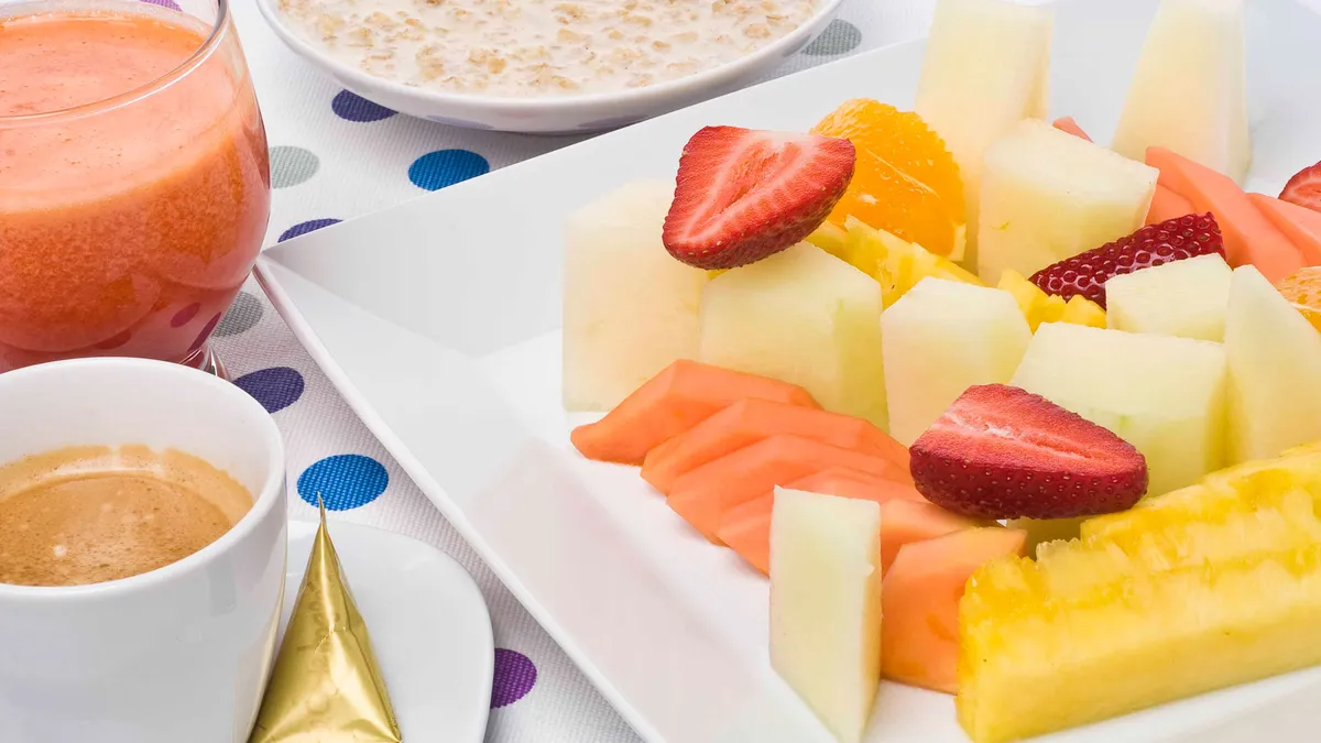 Receta de desayuno con crema de avena y frutas. Bruno Oteiza nos propone un completo desayuno con crema de avena o porridge, frutas, zumo de naranja y fresas y café con leche.