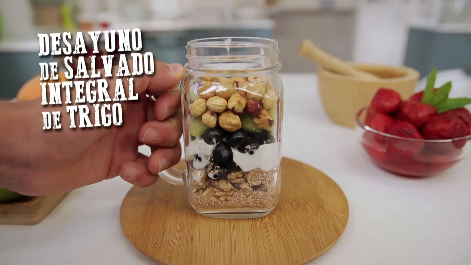 Prepara un desayuno saludable y completo en un vaso con salvado de trigo, yogur, nueces, arándanos, kiwi y avellanas.