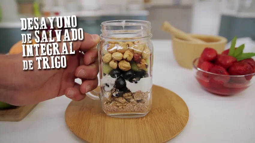 Pon en el fondo de un vaso o tarro la mitad del salvado integral de trigo. Añade las nueces y cúbrelas con la mitad del yogur.