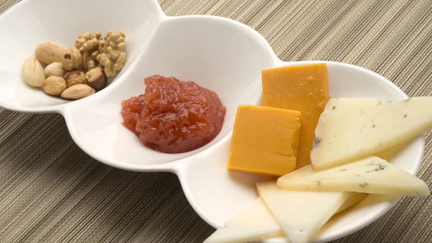 Sirve el membrillo con los quesos y los frutos secos.