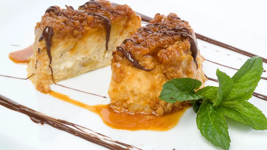 Desmolda el flan de arroz con leche y plátano, decora con unos hilos de chocolate y con unas hojitas de menta.