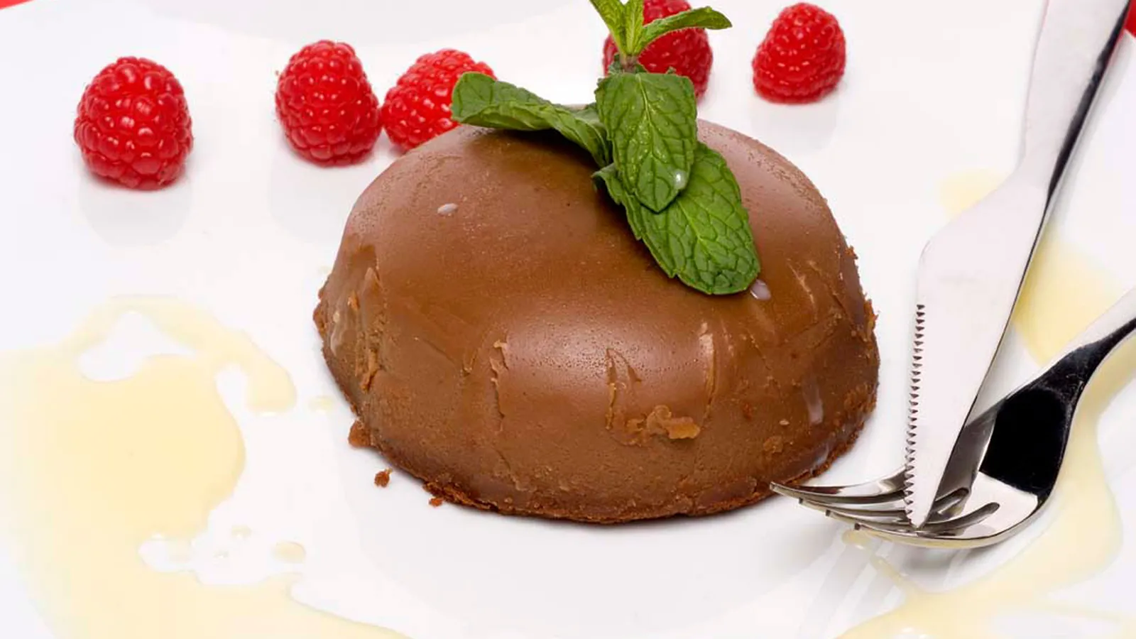 Desmolda los flanes y sírvelos con la crema de plátano por encima. Salsea con la salsa de chocolate blanco y decora con unas frambuesas y unas hojas de menta.