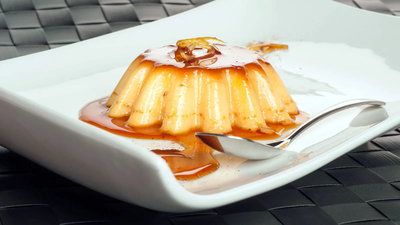 Espolvorea un poco de canela en polvo en el fondo de un plato, desmolda el flan y acompaña con la corteza de limón confitado.