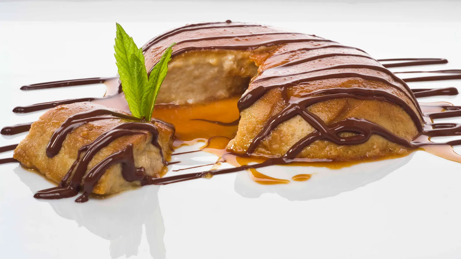 Derrite el chocolate e introdúcelo en un cucurucho de papel. Haz unas rallas de chocolate en el plato y pon encima los flanes. Acompaña con las galletas finamente picadas y decora con menta.