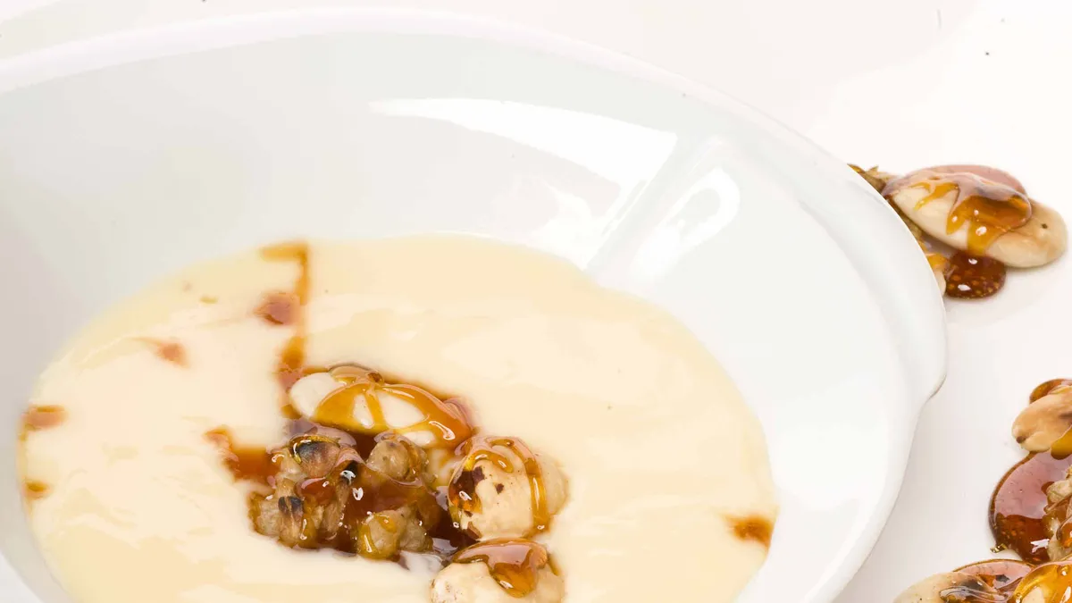 Sirve las galletas en el plato con los frutos secos caramelizados y acompaña con unas natillas.