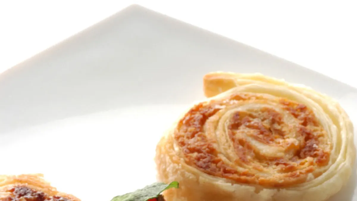 Cubre el hojaldre con la crema pastelera fría y reparte encima las uvas pasas, las almendras y los orejones picados. Recoge la masa de hojaldre en un rollo y corta en porciones. Coloca estas porciones en una placa de horno. Hornea a 160º C. durante 25-30 minutos.