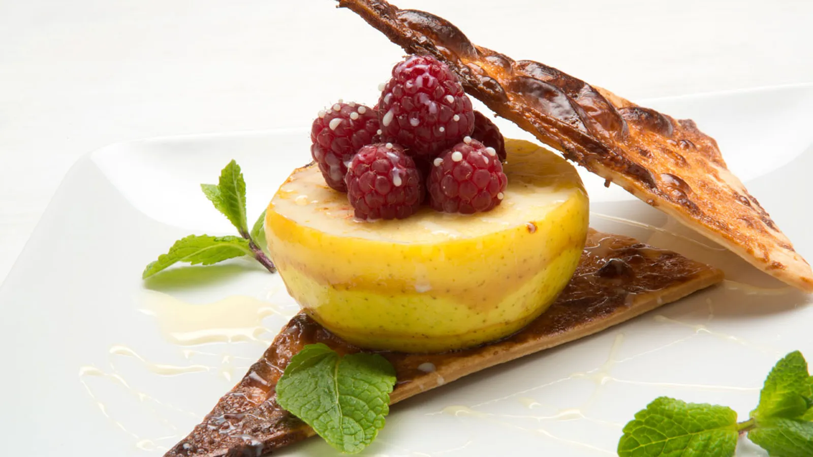 Receta de Eva Arguiñano de Galletas de pasta brisa acompañadas de manzana asada, leche condensada y frambuesas. Un postre fácil y rápido de preparar.