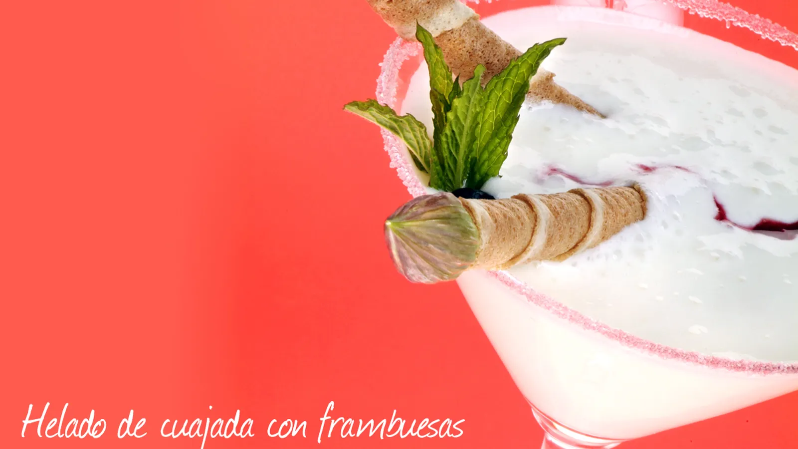 Adorna el borde de las copas mojándolas con granadina y después, pasa el borde por el azúcar. Vierte el sorbete de cuajada y un poco de salsa de frambuesas por encima. Coloca dos canutillos. Puedes adornar con una hoja de menta y un arándano. Sirve el helado de cuajada con frambuesas.