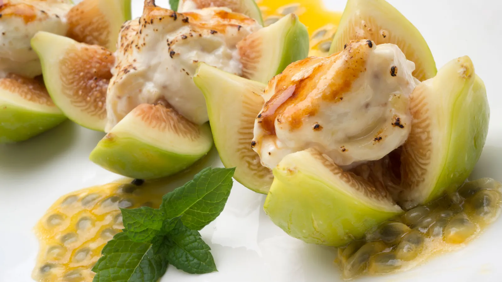 Sirve un poco de salsa de fruta de la pasión y coloca encima los higos rellenos. Decora con una hoja de menta.