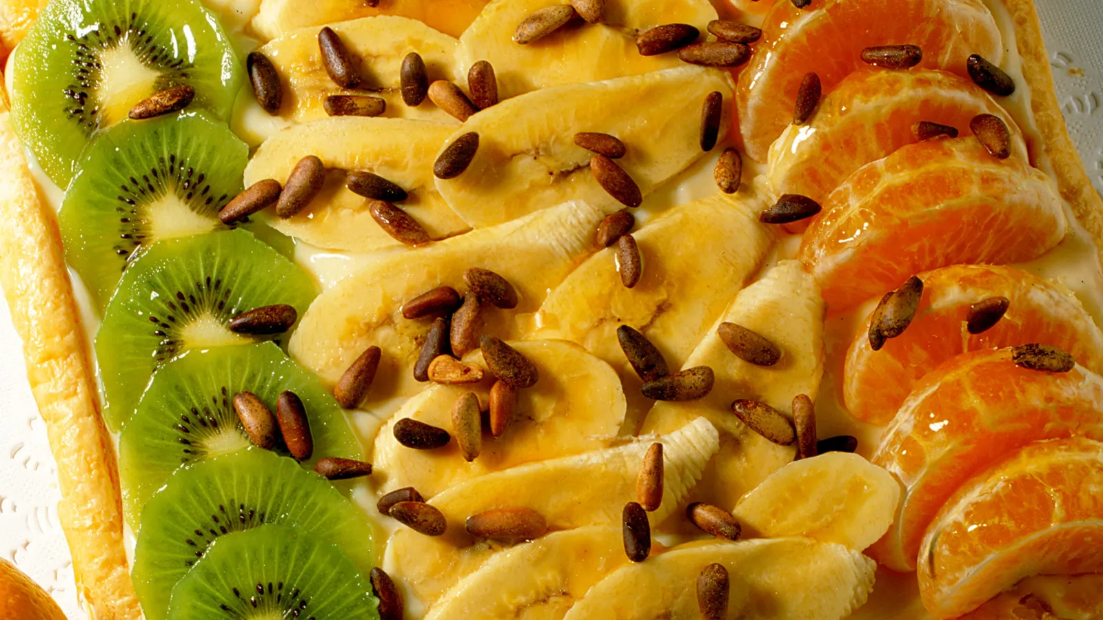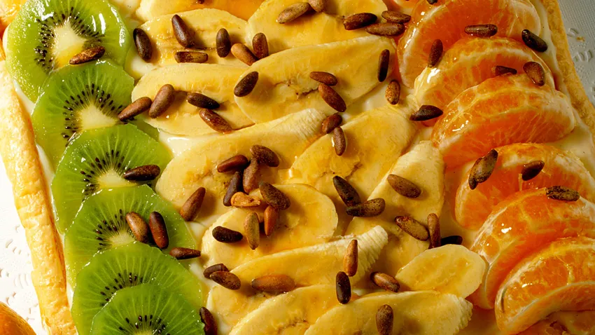 Extendemos bien la crema y la cubrimos primero con las naranjas en gajos, los plátanos fileteados y los kiwis cortados en rodajas.