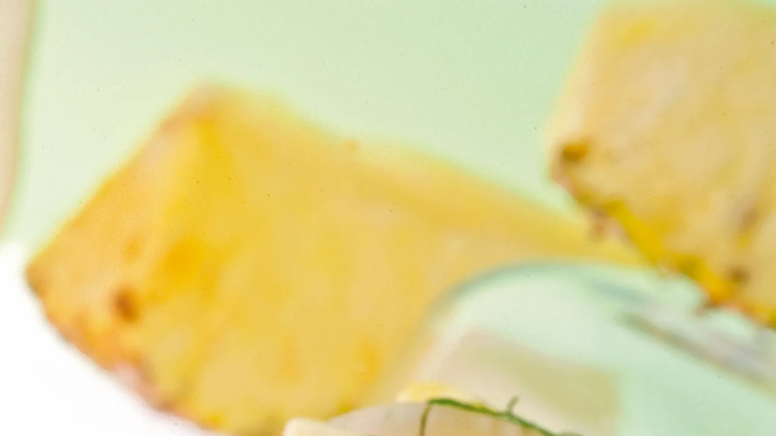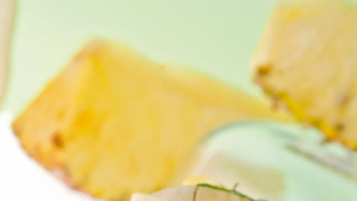 Pela la piña y la pera y córtalas en tiras finas. Pela los plátanos y córtalos en lonchas finas a lo largo. Distribuye las frutas sobre la nata.
