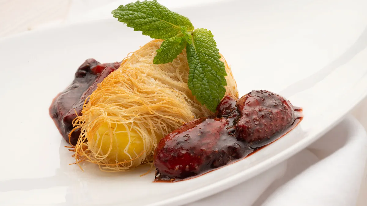 Kataifi con piña y salsa de fresas