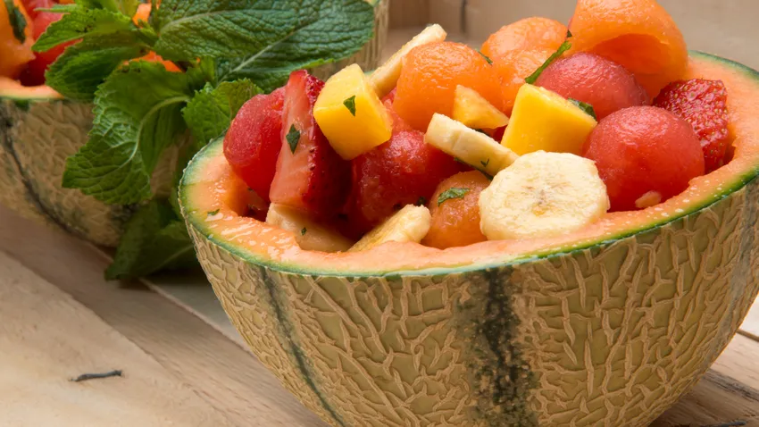 Rellena los melones y adorna con unas hojas de menta.