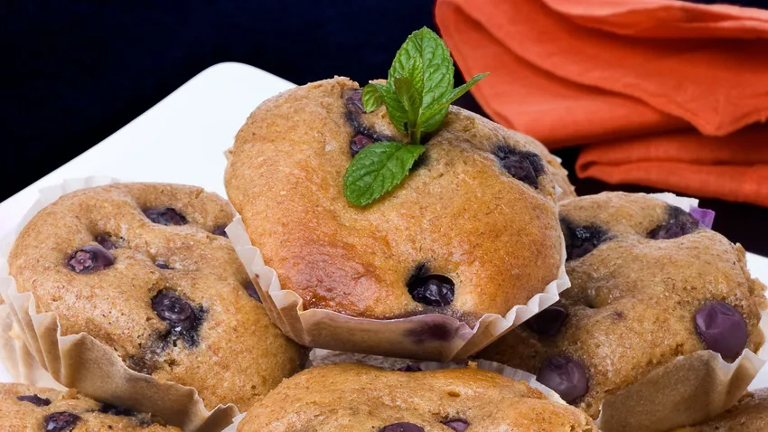 Decora las magdalenas de arandanos con una hojita de menta y sirve.