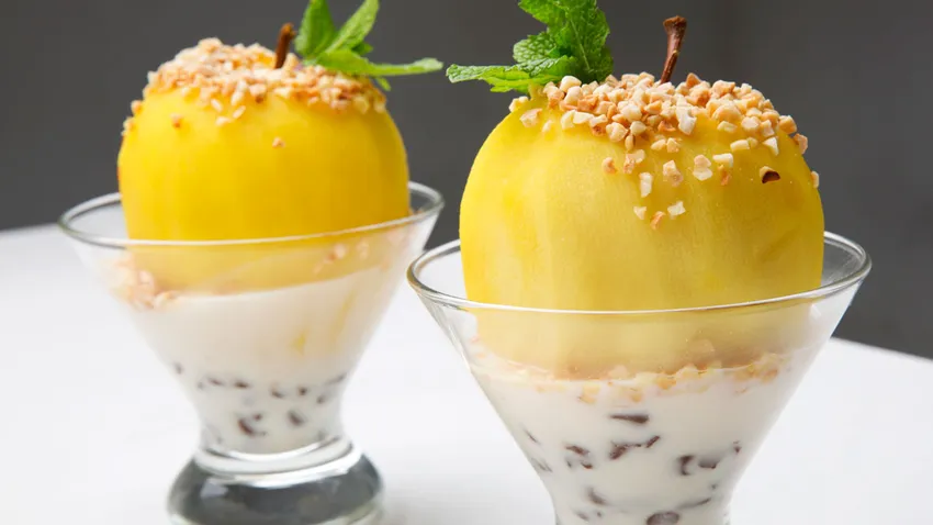 Receta de Eva Arguiñano de manzanas en vaso, un postre de manzanas cocidas al ron y azafrán y acompañadas de yogur con miel y chocolate y almendras tostadas.
