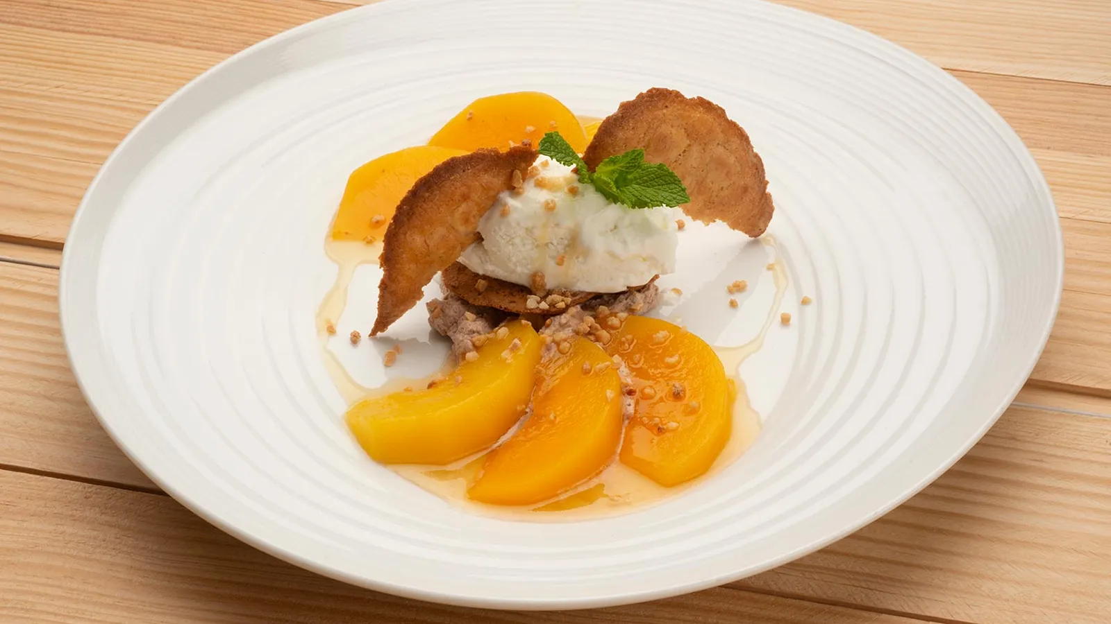 Sirve en la base de los 4 platos una porción de la nata chocolateada, pon encima una teja y una bolita de helado; y distribuye alrededor los gajos de melocotón. Decora con otra teja y salsea todo con el caramelo blando. Espolvorea con el crocanti y decora con unas hojitas de menta.