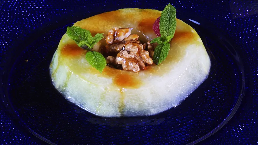 Receta de melón cocinado al horno con azúcar y vainilla y acompañado de una salsa de miel y nueces caramelizadas.