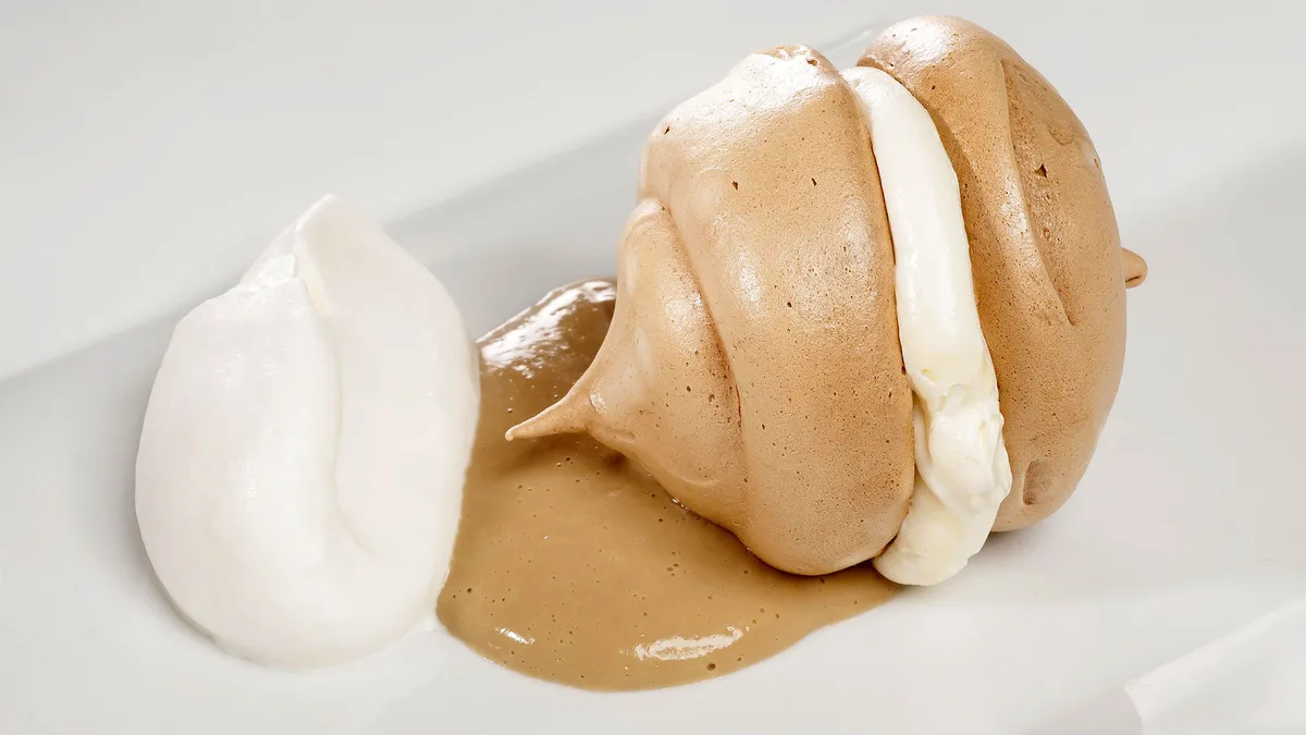 Bruno Oteiza prepara merengues de café en el horno y los presenta rellenos de crema de mantequilla y acompañados de chantilly y crema de café.