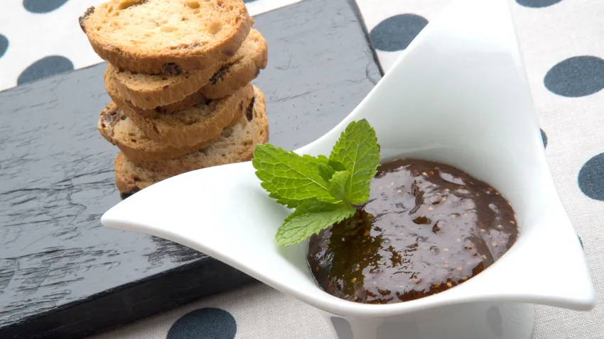 Sirve la mermelada de higos y manzana y acompáñala con unas tostadas de pasas. Adorna con unas hojas de menta.
